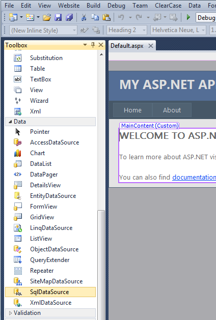 - When you have completed hooking up the SQLDataSource on your page to your database, browse back to the toolbox on the right hand side of your Visual Studio Design View.