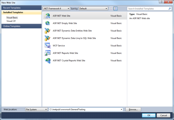 - In the window that opens select your language of choice (I used Visual Basic), then select .NET Framework 4 & ASP.NET Web Site. Under the file system don’t forget to give your new site a name (I called mine GeneralTesting).