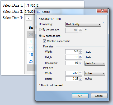 - Then, while still in the resize popup box, I set the Resolution option (which is right below the width and height options. I keep the dimensions drop-down set at pixels/inch (which is the same thing as dpi or Dots Per Inch) and then enter 96 in the resolution entry box.