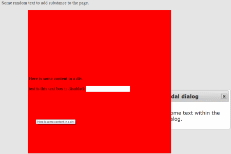 Here we are setting the z-index of the dialog directly in CSS. You can change the z-index of the large absolutely positioned div to be above that of the z-index of the modal dialog. If you do so, you will see that the editable text field in the div remains editable even when the modal dialog is active. If you increase the z-index of the dialog to be higher than that of the div, then the modal dialog will restrict edit access to the form.