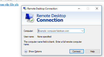 Once you’ve got the RDP in a String, you can then stream the file to the user who clicked on the Web link (as application/rdp). Also remember to set the name to something descriptive (instead of filename=TestRDP.rdp).